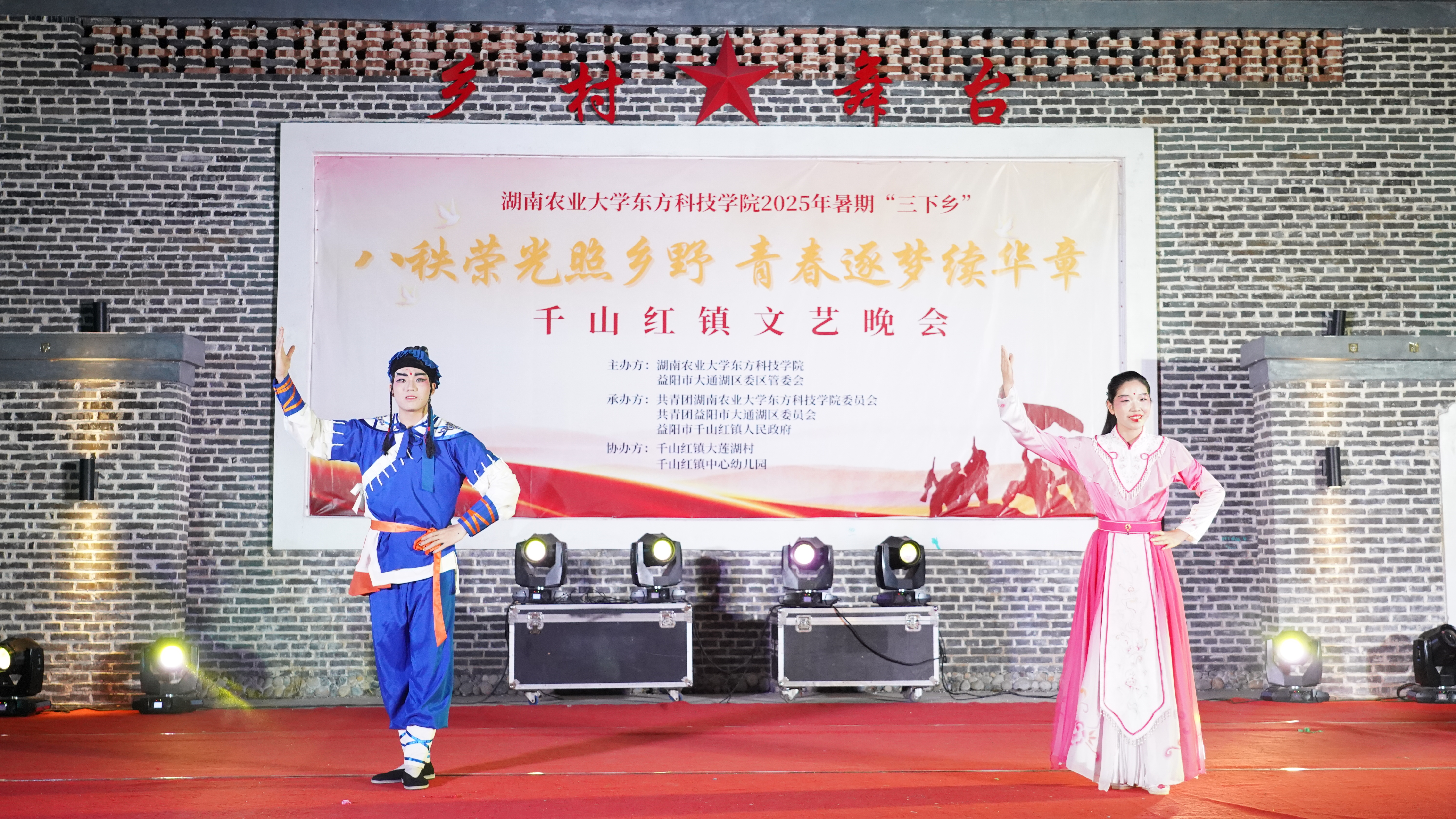 学院与千山红镇携手打造文化盛宴,联合举办"八秩荣光照乡野,青春逐梦续华章"主题文艺晚会。晚会汇聚了志愿者、当地村民与支教学生三方力量,通过歌舞、朗诵、T台秀等丰富多彩的节目形式,生动展现地方文化特色,极大丰富了乡村文娱生活。其中,花鼓戏表演志愿者们以清亮婉转的唱腔和细腻传神的演绎,深情诉说湖湘人家的团圆期盼,彰显非遗艺术的永恒魅力;全体志愿者合唱的《世界赠与我的》将晚会气氛推向高潮,为此次三下乡活动画上圆满句号。